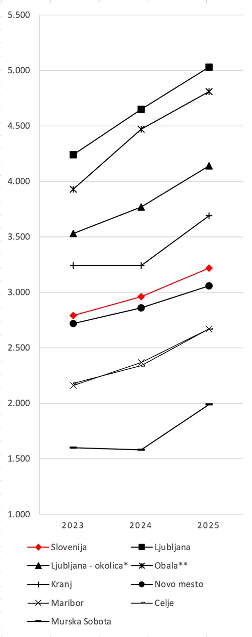 V letu 2025 se je nadaljevala visoka rast cen stanovanj, ki je v zadnjih dveh letih dosegala približno 10 % letno. Rast cen v Ljubljani in na Obali se je nekoliko umirila, medtem ko se je okrepila na območjih z nižjimi cenami stanovanj – v okolici Ljubljane, Kranju, Mariboru in Celju. Število prodajnih transakcij se je po padcu v letu 2024 ponovno povečalo, k čemur je verjetno prispeval tudi nadaljnji padec obrestnih mer. Mediana (srednja) cena kvadratnega metra stanovanja v Sloveniji je prvič presegla mejo 3.000 €/m², v okolici Ljubljane 4.000 €/m², v Ljubljani pa 5.000 €/m². Znatna rast cen je bila zabeležena v vseh opazovanih območjih. Nadpovprečne cene stanovanj so pričakovano v Ljubljani, kjer se proda približno četrtina vseh stanovanj v Sloveniji, na Obali ter v okolici Ljubljane, vključno s Kranjem. Nekoliko pod slovenskim povprečjem so cene stanovanj v Novem mestu in Novi Gorici, sledijo Maribor, Celje in Velenje. Najnižje cene stanovanj so v Murski Soboti, kjer pa so v letu 2025 prav tako močno porasle.