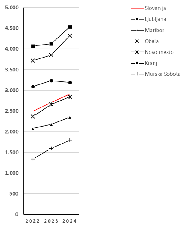 V letu 2024 so cene stanovanj še naprej rasle, na letni ravni med cca. 7 in 8%, podobno kot v prejšnjih dveh letih. Mediana - srednja cena v letu 2024 v Sloveniji prodanega stanovanje je 2.900 € na m2 uporabne površine. Najvišje cene so pričakovano v mestu Ljubljana, kjer je srednja cena dosegla 4.500 €/m2 uporabne površine. Na drugem mestu sledijo stanovanja na obali s srednjo ceno 4.300 €/m2. Nadpovprečne cene stanovanj so še v Kranju, medtem ko so cene stanovanj v Novem mestu in Novi Gorici približno enake Slovenskemu povprečju oz. mediani. Podpovprečne cene stanovanj so v Mariboru 2.350 €/m2, v Celju so cene zelo podobne cenam v Mariboru (2.320 €/m2). Sledijo Jesenice, Velenje in Slovenj Gradec s cenami še nad 2.000€/m2. Med večjimi mesti so bile dosežene najnižje cene v Murski Soboti (1.800 €/m2). Število poslov s stanovanji se v zadnjih dveh letih zmanjšuje na skoraj vseh območjih Slovenije.